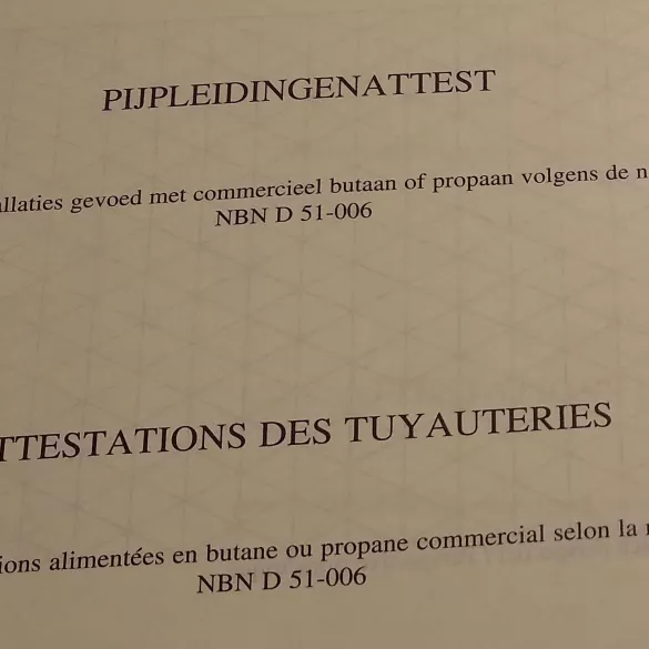 Für jede feste Flüssiggasanlage sind einige Unterlagen erforderlich. Unterlagen über die Gemeinde, die Inbetriebnahme der Anlage, die regelmäßigen Inspektionen, aber auch die Rohrleitungen. Das Rohrleitungszertifikat garantiert, dass die gesamte Anlage gemäß der gesetzlichen Norm NBN D 51 006 installiert wurde.