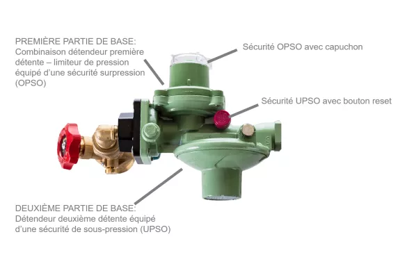 Cette règle est également en vigueur dans le cas d'une installation à gaz propane utilisant l'UPSO-OPSO. Seul le point à partir duquel le gaz est sous basse pression change. Le détendeur première et deuxième détente combiné permet de réduire la pression d'abord en moyenne pression puis une seconde fois en basse pression directement sur la citerne de gaz.