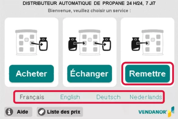 Vous pouvez remettre une bouteille de gaz pour autant qu'il y ait un compartiment libre dans le distributeur. Si trop de bouteilles de gaz ont déjà été remises, il est possible que tous les compartiments soient occupés. Dans ce cas, il n'est plus possible de remettre de bouteilles jusqu'à leur collecte.