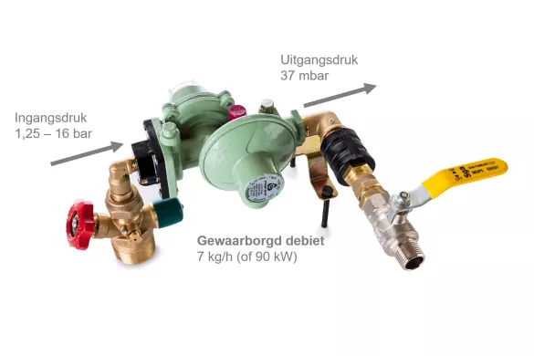 Na de tweede-trapsdrukregelaar is het gas op lagedruk. Vanaf dan is de installateur verantwoordelijk voor de rest van de installatie op lagedruk.