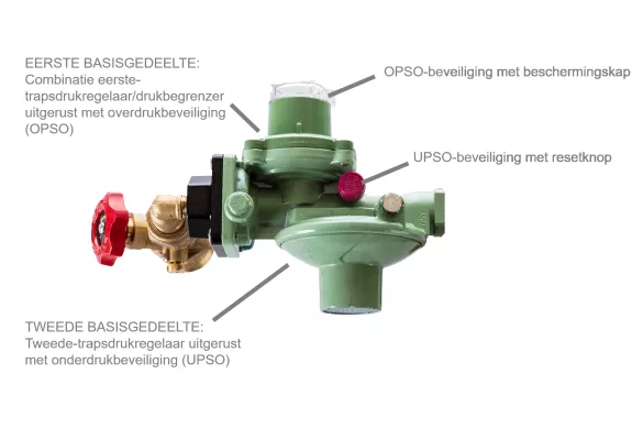 Die regel is niet anders bij een propaangasinstallatie waarbij gebruik wordt gemaakt van de UPSO-OPSO. Het punt vanaf waar het gas op lagedruk komt te staan verandert gewoon. De gecombineerde eerste- en tweede-trapsdrukregelaar zorgt ervoor dat niet alleen de eerste drukverlaging naar middendruk direct aan de gastank gebeurt, maar ook de tweede drukverlaging naar lagedruk.